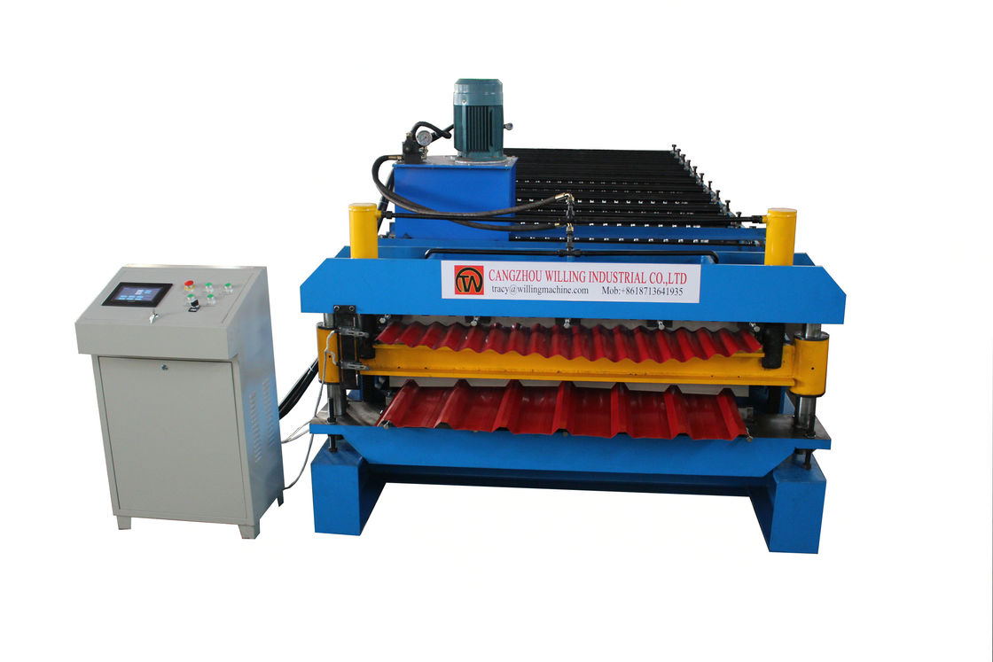 The machine have alternating bottom and upper stands. Rolls for one profile( like ibr sheeting ) are installed in the bottom stands, and rolls for another profile(like corrugated sheeting )are mounted on the upper stands. The whole line will use only one uncoiler, one cutoff unit, one controlled box. But the machine can’t produce the 2 profiles at the same time.