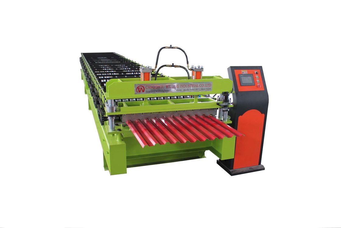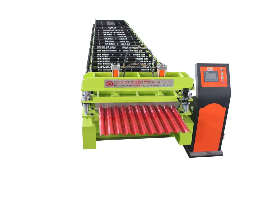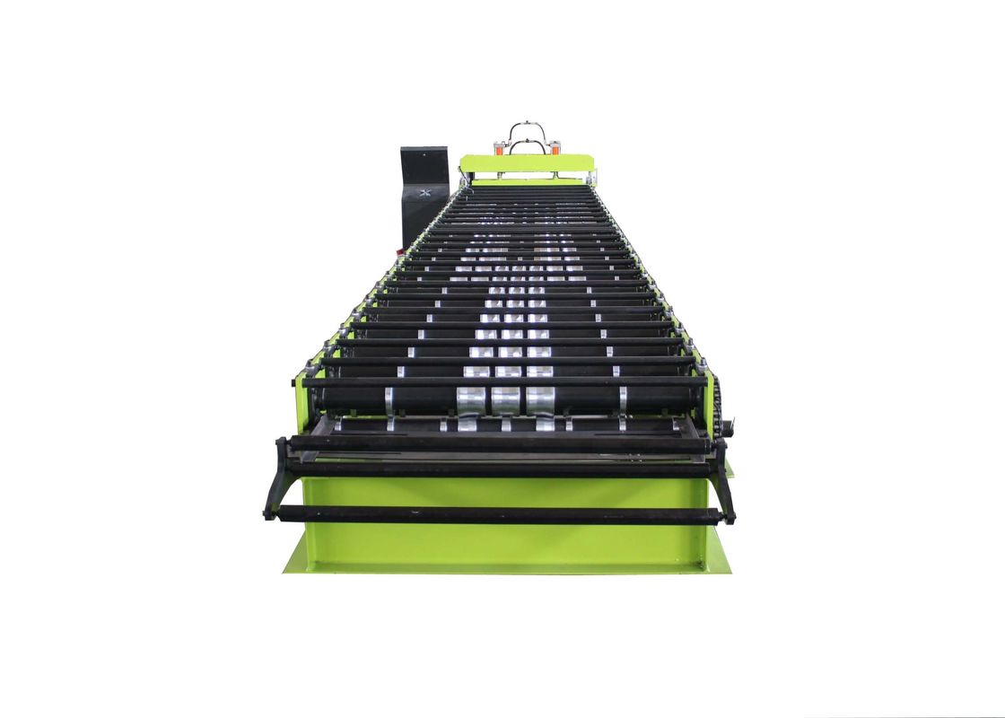 Our roll forming machine consists of the following parts: the main body of the color steel tile press, the PLC computer control system, the hydraulic pump station system, and the automatic post-cutting system.