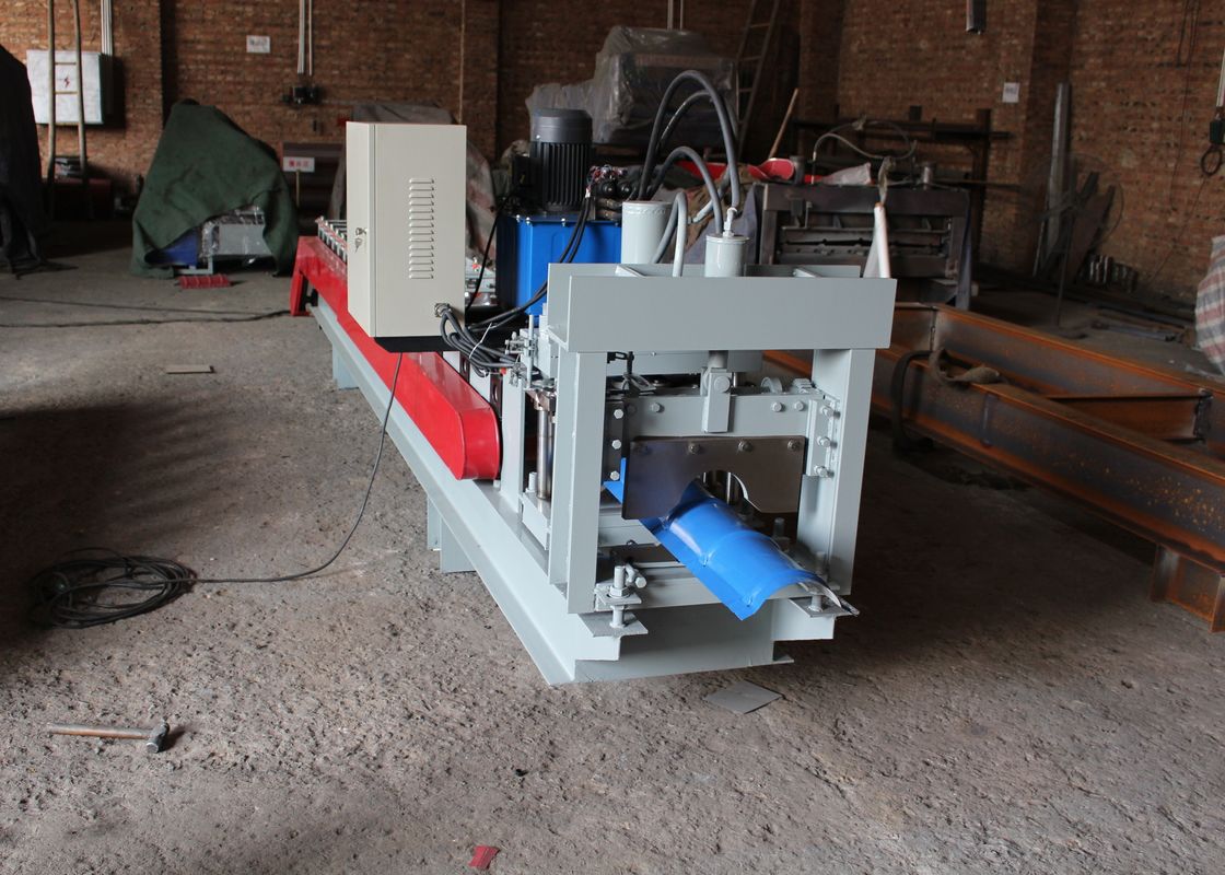 The ridge tile forming equipment adopts roller forming technology and is used for hydraulic forming with a die. Products are widely used in the roof connection of building color steel plates. The host adopts programmable controller and touch screen control, and the speed is continuously adjustable. Fully automatic length setting and cutting, easy to operate. This machine can be customized according to customer requirements
