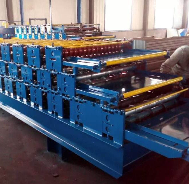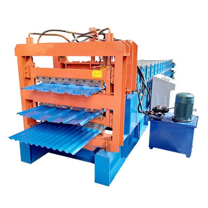 The Triple Layer roof roll forming machine is a Triple Layer color steel tile production equipment with one machine. It can produce glazed tiles, trapezoidal roof tiles and corrugated wall tiles at the same time. One machine can produce three types of color steel roof tile building materials. The machine is composed of a feeding rack, a feeding platform, a pressing host, a leveling roller, and cutting after forming. It is fully automatic computer control and simple and convenient to operate. The value that the triple-layer tile machine can create for users is the core. One machine has multiple functions, which not only saves the area but also reduces the cost. The triple-layer tile machine has a light structure and is especially suitable for customers with small sites and on-site construction.