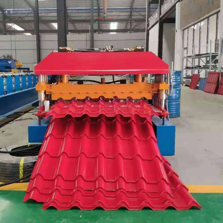 Customized sheet glazed tile roll forming machine steel coil mould equipment is customized . The speed of roll forming machine is 8m/min. It is double speed than normal 3-4m/min. This roll forming machine can meet standard of CE. Our metal roof machine is very popular in Euro and America. Our glazed tile can build beautiful roof, Every pitch is same with 350mm. 350mm is standard of Euro market. No cut surface painting. There is no gaps when installation